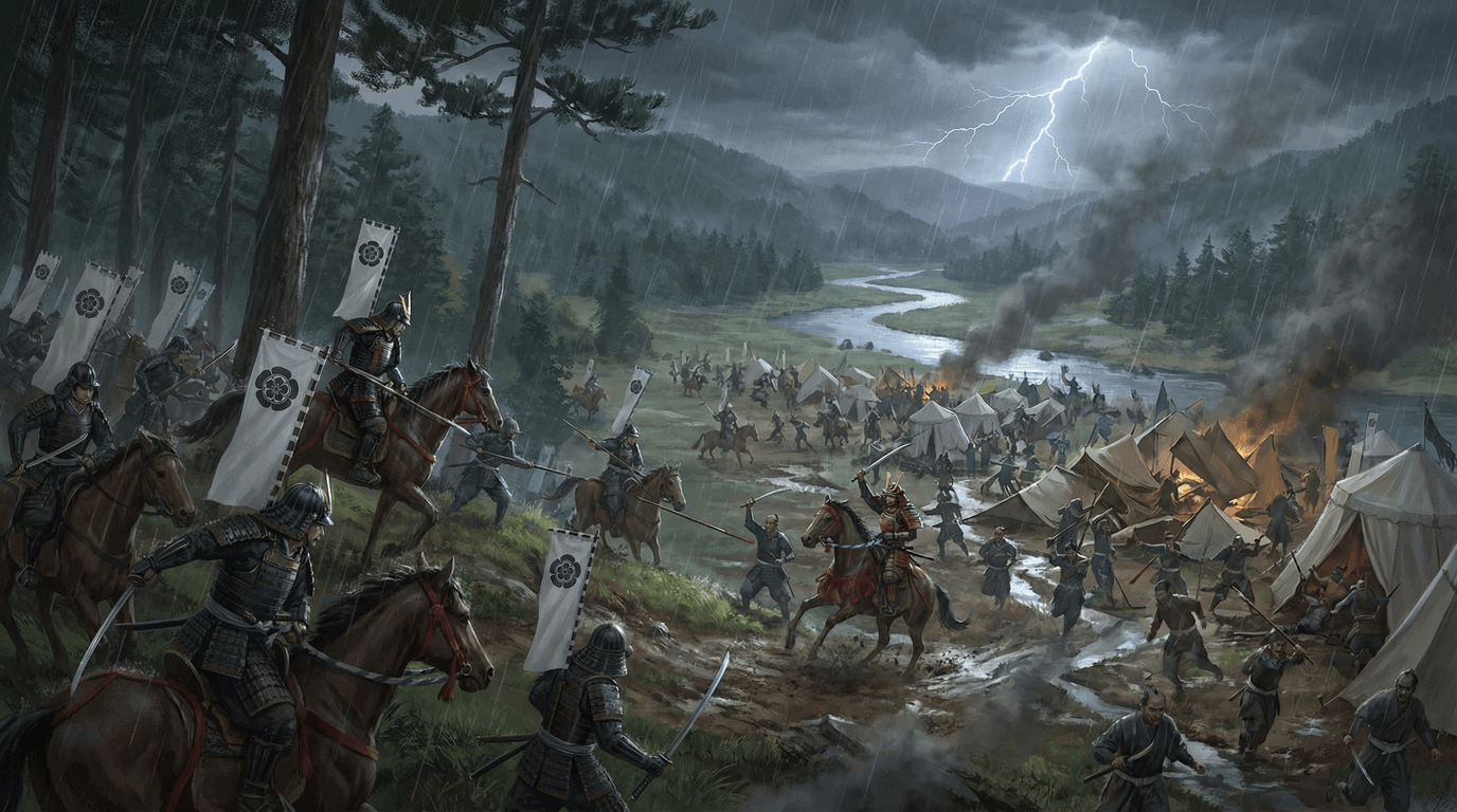 Alors que les troupes d’Imagawa célèbrent leurs premières victoires, Nobunaga choisit de frapper rapidement et de manière inattendue. Profitant d’un violent orage et de la dispersion partielle des forces ennemies, il mène une attaque surprise directement sur le camp principal d’Imagawa.